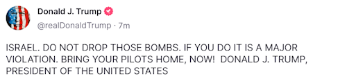 Trump used his Truth Social social media account to caution Israel against bombing Iran any more, stating that doing so would breach the ceasefire he is attempting to mediate between the two countries.