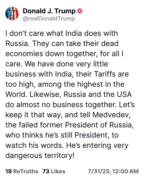 Posting on Truth Social, Trump wrote, “I don’t care what India does with Russia. They can take their dead economies down together, for all i care.”