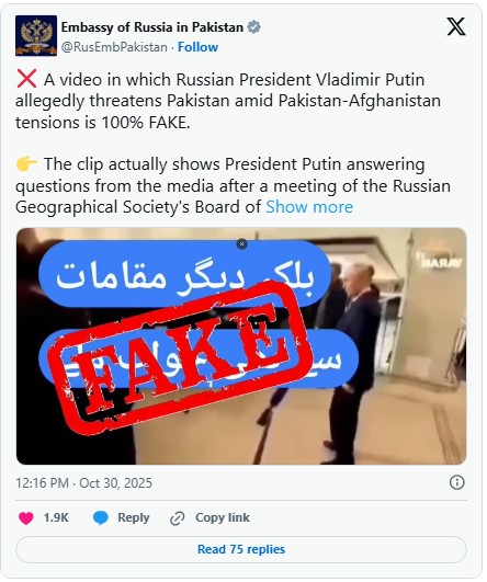 The Russian Embassy in Pakistan has firmly dismissed as “100% fake” a viral video circulating on social media that falsely shows President Vladimir Putin issuing threats to Pakistan amidst escalating tensions between Islamabad and Kabul. The misleading video, which was widely shared by pro-Afghan and Indian accounts on X, purportedly depicted Putin warning Pakistan’s military and expressing support for Afghanistan.