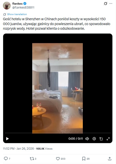 A hotel guest in Shenzhen, China, has been billed 150,000 yuan (around USD 21,000) after causing extensive water damage by using a fire-suppression sprinkler as a makeshift clothes rack. Seeking a convenient spot to dry laundry, the guest hung damp garments on the sprinkler head, inadvertently triggering its heat-sensitive mechanism.