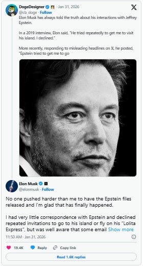 Elon Musk has expressed strong support for the release of the Jeffrey Epstein files, emphasizing the importance of transparency while denying any close association with the convicted financier. On January 31, 2026, Musk wrote on X: “No one pushed harder than me to have the Epstein files released, and I’m glad that has finally happened.”