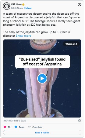 The video shows the jellyfish drifting through the “midnight zone,” a part of the ocean devoid of sunlight. The creature features a deep reddish-purple bell over three feet wide and four ribbon-like oral arms extending up to 33 feet. Unlike typical jellyfish, it lacks stinging tentacles, instead using its massive, scarf-like arms to trap and consume prey.