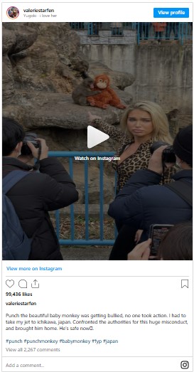 Emotional videos claiming that “Valerie Starfen” flew to Ichikawa, Japan, on a private jet to rescue and adopt a bullied baby monkey named Punch have gone viral on social media.