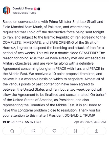 Trump confirmed Washington had received a 10-point plan from Iran, calling it a “workable basis” for negotiations and stating that most long-standing issues have been addressed. The ceasefire aims to allow both sides to finalize a comprehensive agreement to end hostilities.