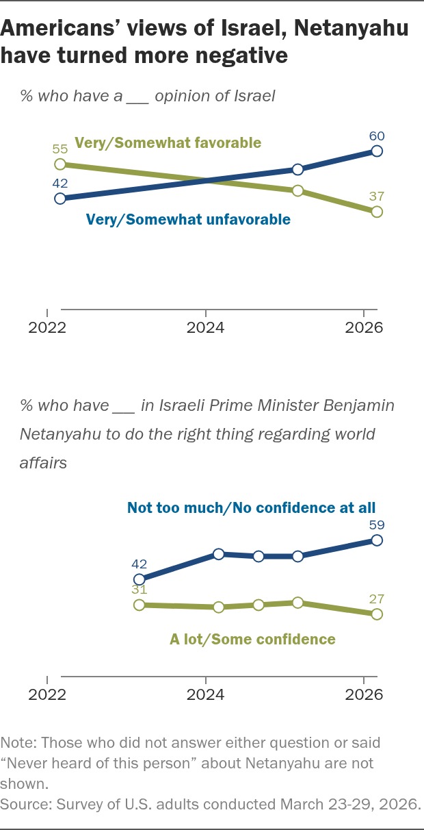 The report also shows how opinions have changed over the years. In 2022, only 42 percent of Americans had a negative view of Israel. This number increased to 53 percent in 2025, and now it has reached nearly 60 percent in 2026.